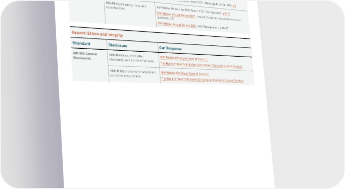 BNY MELLON ENTERPRISE ESG 92 APPENDIX Aspect: Strategy Standard Disclosure Our Response GRI 102: General Disclosures 102-14 Statement from senior decision makers BNY Mellon Annual Report 2021 , CEO Letter, p.I BNY Mellon Enterprise ESG Report 2021, Message From Our CEO, p.6 102-15 Key impacts, risks, and opportunities BNY Mellon Enterprise ESG Report 2021, Our Approach, p . 8 -17 BNY Mellon Annual Report 2021 , Impact of coronavirus pandemic on our business, p.5 BNY Mellon Annual Report 2021 , Risk Management, p.50-57 Aspect: Ethics and Integrity Standard Disclosure Our Response GRI 102: General Disclosures 102-16 Values, principles, standards, and norms of behavior BNY Mellon Employee Code of Conduct The Bank Of New York Mellon Corporation Directors’ Code of Conduct 102-17 Mechanisms for advice and concerns about ethics BNY Mellon Employee Code of Conduct The Bank Of New York Mellon Corporation Directors’ Code of Conduct