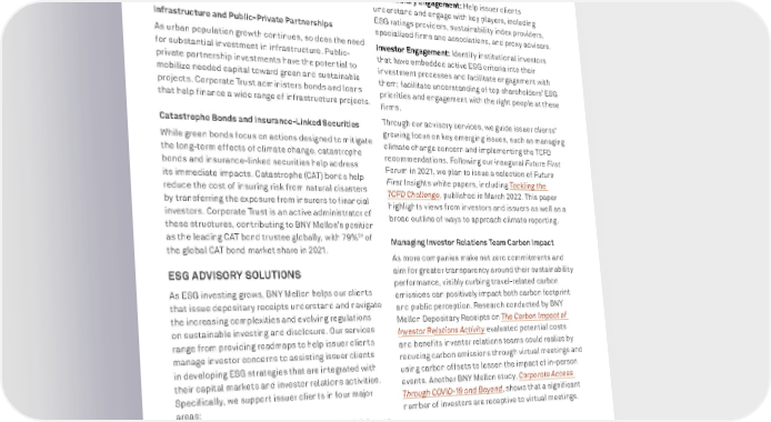 BNY MELLON ENTERPRISE ESG 62 RESPONSIBLE BUSINESS We act as a listing agent for issuers listing securities on the Luxembourg Green Exchange, a platform exclusively for 100% ESG-focused securities. We also continue to maintain “Observer” status to the International Capital Market Association’s Green Bond Principles, which are voluntary process guidelines to promote integrity and transparency in the market. Infrastructure and Public-Private Partnerships As urban population growth continues, so does the need for substantial investment in infrastructure. Public- private partnership investments have the potential to mobilize needed capital toward green and sustainable projects. Corporate Trust administers bonds and loans that help finance a wide range of infrastructure projects. Catastrophe Bonds and Insurance-Linked Securities While green bonds focus on actions designed to mitigate the long-term effects of climate change, catastrophe bonds and insurance-linked securities help address its immediate impacts. Catastrophe (CAT) bonds help reduce the cost of insuring risk from natural disasters by transferring the exposure from insurers to financial investors. Corporate Trust is an active administrator of these structures, contributing to BNY Mellon’s position as the leading CAT bond trustee globally, with 79% 28 of the global CAT bond market share in 2021. ESG ADVISORY SOLUTIONS As ESG investing grows, BNY Mellon helps our clients that issue depositary receipts understand and navigate the increasing complexities and evolving regulations on sustainable investing and disclosure. Our services range from providing roadmaps to help issuer clients manage investor concerns to assisting issuer clients in developing ESG strategies that are integrated with their capital markets and investor relations activities. Specifically, we support issuer clients in four major areas: Education and Benchmarking: Identify material themes within peer groups and industries, including company- specific ESG ratings, peer benchmarking reports, sector trends and regional trends. 28 Catastrophe Bond & Insurance-Linked Securities Deal Directory , Artemis Engagement Policy and Strategy: Develop roadmaps to assist in understanding investors’ specific ESG concerns, reviewing internal ESG practices, and enhancing communications efforts with investors and other relevant stakeholders. Intermediary Engagement: Help issuer clients understand and engage with key players, including ESG ratings providers, sustainability index providers, specialized firms and associations, and proxy advisers. Investor Engagement: Identify institutional investors that have embedded active ESG criteria into their investment processes and facilitate engagement with them; facilitate understanding of top shareholders’ ESG priorities and engagement with the right people at these firms. Through our advisory services, we guide issuer clients’ growing focus on key emerging issues, such as managing climate change concern and implementing the TCFD recommendations. Following our inaugural Future First Forum in 2021, we plan to issue a selection of Future First Insights white papers, including Tackling the TCFD Challenge , published in March 2022. This paper highlights views from investors and issuers as well as a broad outline of ways to approach climate reporting. Managing Investor Relations Team Carbon Impact As more companies make net zero commitments and aim for greater transparency around their sustainability performance, visibly curbing travel-related carbon emissions can positively impact both carbon footprint and public perception. Research conducted by BNY Mellon Depositary Receipts on The Carbon Impact of Investor Relations Activity evaluated potential costs and benefits investor relations teams could realize by reducing carbon emissions through virtual meetings and using carbon offsets to lessen the impact of in-person events. Another BNY Mellon study, Corporate Access Through COVID-19 and Beyond , shows that a significant number of investors are receptive to virtual meetings. Engaging Issuers and Investors In 2021, we deepened conversations between our Depositary Receipt issuer clients and institutional investors across the U.S. by hosting our inaugural Future First Forum ESG Investor Conference. At this conference, BNY Mellon Capital Markets hosted issuer- to-investor one-on-one meetings for our issuers in the