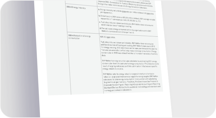 BNY MELLON ENTERPRISE ESG 100 APPENDIX 302-2 Energy consumption outside of the organization BNY Mellon follows The Corporate Standard Greenhouse Gas Protocol for calculating emissions and energy use. An Operational Control boundary is used. BNY Mellon considers energy consumed from purchased goods and services, capital goods, fuel-and-energy-related activities, upstream transportation and distribution, business travel, employee commuting, downstream leased assets, and investments relevant to our operations. For more detail on methodologies and assumptions used, please see CDP response 2020. Conversions for Fuel and Electricity were done with the U.S. Energy Information Administration’s Energy Conversion Calculator. 302-3 Energy intensity a. Energy intensity ratio: 62.84 gigajoules per million dollars; 0.90 gigajoules per square foot. b. Denominators: 2021 revenue (15,931 million dollars); 2021 average rentable square feet of real estate portfolio (11,180,541 sq. ft.). c. Fuel, electricity and steam are included; BNY Mellon does not consume additional sources of heating or cooling. d. The ratio uses energy consumed within the organization within BNY Mellon’s operational control scope 1 and 2. 302-4 Reduction of energy consumption 625,309 gigajoules. Fuel, electricity and steam are included; BNY Mellon does not consume additional sources of heating and cooling. BNY Mellon’s base year is 2010 for energy tracking. 2010 was chosen as the base year because this was this first year we were able to effectively measure energy consumption. Energy consumption in 2010 was rebaselined due to increase in accuracy of activity data. BNY Mellon’s energy reduction was calculated by subtracting 2021 energy consumption from the base year’s energy consumption. This reduction is the result of ongoing real estate portfolio optimization initiatives and specific energy reduction projects. BNY Mellon sets its energy reduction targets in the form of emission reduction targets as these are a surrogate for energy targets. BNY Mellon calculates its total energy consumption in conjunction with calculating its greenhouse gas inventory. Therefore, The Greenhouse Gas Protocol: A Corporate Accounting and Reporting A Corporate Accounting and Reporting Standard (Revised Edition) is the published methodology and standard used in energy and emission calculation.
