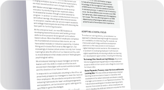 BNY MELLON ENTERPRISE ESG 28 CULTURE AND PURPOSE EXPANDING OPPORTUNITIES FOR GROWTH BNY Mellon provides a wealth of development opportunities to help people advance their careers and progress within our organization. We believe the strength of our offerings contributes to the fact that 33% of open positions were filled by internal candidates in 2021. However, in recognition of the need to stay current with changing workplace dynamics and worker expectations, we made several additions and changes during 2021. BNY Mellon encourages employees to continue their education by reimbursing certain expenses related to educational courses through a tuition assistance program. In addition to tuition reimbursement discounts and school savings, the program also includes access to education coaches who can provide expert academic and college financing advice and help with choosing the best path for furthering education. At the enterprise level, our new DEI Academy is developing leadership acumen and building critical skills to drive purpose-driven growth and a values- based culture. More than 99% of employees completed the foundational unconscious bias course, and we have added modules on Inclusive Leadership, Inclusive Hiring and Inclusive Performance Management. Our increasingly inclusive culture arises not only from formal training but also the efforts of our leaders as they seek to model behaviors that create a sense of belonging and psychological safety. We introduced training to equip managers and senior leaders with the skills to create an effective work environment that aligns with current workforce needs and the direction of our future of work. In response to our employees returning to the office, we proactively prepared our managers to meet the needs of their employees. We provided a comprehensive toolkit, including frameworks for team working arrangements and exceptions, and a discussion guide, talking points and FAQs to guide the dialogue. We provided training on our Purpose-Driven Growth Agenda, which connects the company’s purpose and vision to build a culture that is both high performing and human centered. Targeted training was delivered to all senior leaders to equip them to hold culture activation sessions that engage teams to discuss how the new values can be applied and integrated into daily performance. SPOTLIGHT ESG-Aware Employees We introduced an ESG Certification program to help all employees build and advance their knowledge of the management and integration of ESG factors into business operations and the investment process. In addition to an introductory video, the three ESG-focused modules cover ESG fundamentals, client solutions and the regulatory landscape. This new offering supports our ESG objectives by enhancing our ability to deliver a powerful and differentiated client experience. ADOPTING A DIGITAL FOCUS To evolve our training delivery, we accelerated our approach to blended learning through the expansion and availability of online learning. For example, we introduced a technology workforce development platform to offer easy access to technical and digital training to a wider audience. We increased our investment in developing employees’ technical and digital capabilities by introducing multiple new learning and development opportunities, including the following: Technology Role-Based Learning Pathways. We provide 56 role-targeted learning pathways to help employees advance skills in their current role or begin to cross-train for future roles. Global Payments, Treasury, Issuer Services and Markets Learning Hub. This new online portal provides directed learning recommendations based on identified skill development for select individual contributors, people managers and directors in our Operations business. The hub provides exciting and innovative learning content, sourced from external vendors, where employees can aim to develop the skills and behaviors required for their current and future roles. Tour de Learning. This innovative seven-week gamified learning event delivers technology and digital learning to our Global Operations and Technology organization.