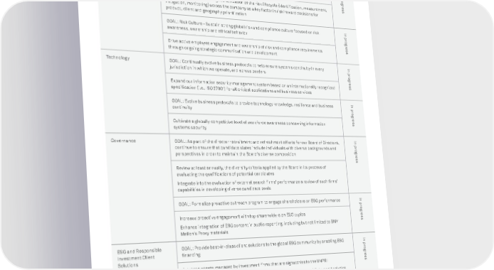 BNY MELLON ENTERPRISE ESG 14 APPROACH Responsible Business 2025 Goals and Key Performance Indicators Risk Management * GOAL: Risk Framework - Continue to evolve and fortify our risk infrastructure's integration into BAU practices across the organization In progress Promote consistent and aligned utilization of the risk lifecycle (identification, measurement, mitigation, monitoring) across the company as a key factor in risk/reward decisions for product, client and geography prioritization GOAL: Risk Culture - Sustain strong global risk and compliance culture focused on risk awareness, ownership and ethical behavior In progress Drive active employee engagement and ownership of risk and compliance requirements through ongoing strategic communication and development Technology GOAL: Continually evolve business protocols to help ensure systems continuity in every jurisdiction in which we operate, and across borders In progress Expand our information security management system based on an internationally recognized specification (i.e., ISO 27001) for all critical applications and business services GOAL: Evolve business protocols to provide technology knowledge, resilience and business continuity In progress Cultivate a globally competitive level of workforce awareness concerning information systems security Governance GOAL: As part of the director recruitment and refreshment efforts for our Board of Directors, continue to ensure that candidate slates include individuals with diverse backgrounds and perspectives in order to maintain the Board’s diverse composition In progress Review at least annually, the diversity criteria applied by the Board in its process of evaluating the qualifications of potential candidates Integrate into the evaluation of external search firms’ performance a review of such firms’ capabilities in developing diverse candidate pools GOAL: Formalize proactive outreach program to engage shareholders on ESG performance In progress Increase proactive engagement with top shareholders on ESG topics Enhance integration of ESG content in public reporting, including but not limited to BNY Mellon’s Proxy materials ESG and Responsible Investment Client Solutions GOAL: Provide best-in-class client solutions to the global ESG community by enabling ESG financing In progress Increase assets managed by investment firms that are signatories to the UNPRI Increase number of clients who use our ESG Global Risk Solutions, and Data and Analytics solutions Increase volume of new green bonds administered Demonstrate ESG thought leadership and proof points as measured by industry recognition and client satisfaction metrics * Language in the goals were refined to provide clarity