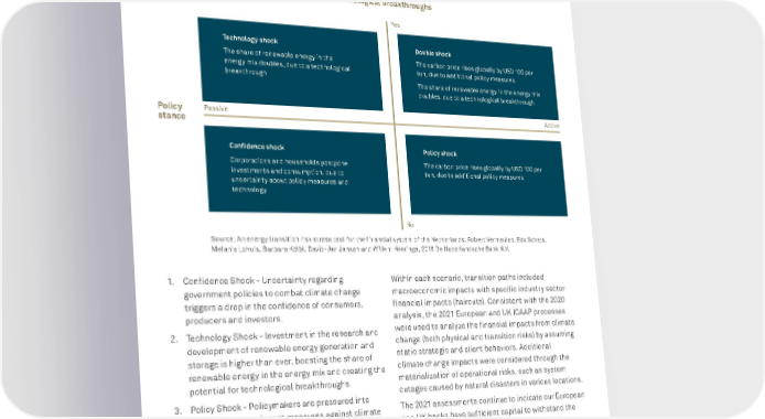 BNY MELLON ENTERPRISE ESG 76 GLOBAL CITIZENSHIP 1. Confidence Shock - Uncertainty regarding government policies to combat climate change triggers a drop in the confidence of consumers, producers and investors. 2. Technology Shock - Investment in the research and development of renewable energy generation and storage is higher than ever, boosting the share of renewable energy in the energy mix and creating the potential for technological breakthroughs. 3. Policy Shock - Policymakers are pressured into taking abrupt, stringent measures against climate change, triggered by, for example, (i) a natural disaster, (ii) legal action holding policymakers accountable for climate change, or (iii) a strong reaction by policymakers in response to the realization that the time to act is running out. 4. Double Shock - Climate change mitigation policies and progress in renewable energy technology turn out to be mutually reinforcing. Within each scenario, transition paths included macroeconomic impacts with specific industry sector financial impacts (haircuts). Consistent with the 2020 analysis, the 2021 European and UK ICAAP processes were used to analyze the financial impacts from climate change (both physical and transition risks) by assuming static strategic and client behaviors. Additional climate change impacts were considered through the materialization of operational risks, such as system outages caused by natural disasters in various locations. The 2021 assessments continue to indicate our European and UK banks have sufficient capital to withstand the four scenarios analyzed, over the given time horizons. These assessments are now being further enhanced for the 2022 ICAAP to reflect the NGFS scenarios and assumptions to better understand the impacts of climate change with industry standard scenarios. (2) technological breakthroughs that lower CO2 emissions but also disrupt parts of the economic system through a process of creative destruction. As part of our stress testing exercise, the European Bank and the UK Bank enhanced their analysis over the 2020 exercise by using four different academically defined climate change scenarios for the impact analysis. These scenarios are described below: Passive Yes No Active Technological breakthroughs Policy stance Technology shock The share of renewable energy in the energy mix doubles, due to a technological breakthrough Confidence shock Corporations and households postpone investments and consumption, due to uncertainty about policy measures and technology Double shock The carbon price rises globally by USD 100 per ton, due to additional policy measures The share of renewable energy in the energy mix doubles, due to a technological breakthrough Policy shock The carbon price rises globally by USD 100 per ton, due to additional policy measures Source: An energy transition risk stress test for the financial system of the Netherlands; Robert Vermeulen, Edo Schets, Melanie Lohuis, Barbara Kölbl, David-Jan Jansen and Willem Heeringa, 2018 De Nederlandsche Bank N.V.