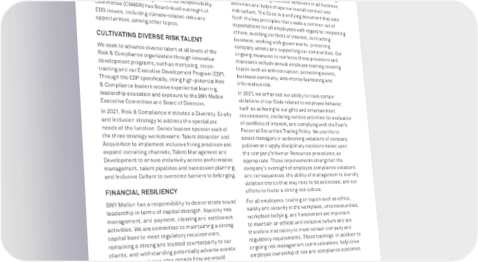 BNY MELLON ENTERPRISE ESG 4 4 RESPONSIBLE BUSINESS RISK GOVERNANCE BNY Mellon maintains a risk governance structure designed to result in comprehensive risk oversight. The Board of Directors oversees risk management through two key Board committees: the Risk Committee and the Audit Committee. Additionally, the Corporate Governance, Nominating and Social Responsibility Committee (CGNSR) has Board-level oversight of ESG issues, including climate-related risks and opportunities, among other topics. CULTIVATING DIVERSE RISK TALENT We seek to advance diverse talent at all levels of the Risk & Compliance organization through innovative development programs, such as mentoring, cross- training and our Executive Development Program (EDP). Through the EDP specifically, rising high-potential Risk & Compliance leaders receive experiential learning, leadership education and exposure to the BNY Mellon Executive Committee and Board of Directors. In 2021, Risk & Compliance instituted a Diversity, Equity and Inclusion strategy to address the specialized needs of the function. Senior leaders sponsor each of the three strategy workstreams: Talent Attraction and Acquisition to implement inclusive hiring practices and expand recruiting channels; Talent Management and Development to ensure inclusivity across performance management, talent pipelines and succession planning; and Inclusive Culture to overcome barriers to belonging. FINANCIAL RESILIENCY BNY Mellon has a responsibility to demonstrate sound leadership in terms of capital strength, liquidity risk management, and payment, clearing and settlement activities. We are committed to maintaining a strong capital base to meet regulatory requirements, remaining a strong and trusted counterparty to our clients, and withstanding potentially adverse events. Our global resolution plan details how we would maintain critical operations in case of our failure or insolvency. Our 2021 stress test results demonstrated our financial strength and commitment to maintain robust levels of loss-absorbing capital. Compliance and Ethical Behavior BNY Mellon’s Code of Conduct applies to all employees. At the foundation of our Code are our Values: Passion for Excellence, Integrity, Strength in Diversity and Courage to Lead. This Code guides our behaviors in all business activities and helps shape our overall conduct and risk culture. The Code is a unifying document that sets forth the key principles that create a common set of expectations for all employees with regard to: respecting others, avoiding conflicts of interest, conducting business, working with governments, protecting company assets and supporting our communities. Our ongoing measures to reinforce these provisions and standards include annual employee training covering topics such as anti-corruption, protecting assets, business continuity, anti-money laundering and information risk. In 2021, we enhanced our ability to track certain violations of our Code related to employee behavior, such as adhering to our gifts and entertainment requirements, declaring outside activities for evaluation of conflicts of interest, and complying with the Firm’s Personal Securities Trading Policy. We use this to assist managers in addressing violations of company policies and apply disciplinary decisions based upon the company’s Human Resources procedures, as appropriate. These improvements strengthen the company’s oversight of employee compliance violations and consequences, the ability of management to identify violation trends that may need to be addressed, and our efforts to foster a strong risk culture. For all employees, training on topics such as ethics, safety and security in the workplace, unconscious bias, workplace bullying, and harassment are important to maintain an ethical and inclusive culture and are therefore mandatory to meet certain company and regulatory requirements. These trainings, in addition to ongoing risk management communications, help drive employee ownership of risk and compliance outcomes. ESCALATION AND SPEAKING UP We take any breach of rules, laws, regulations, policies or standards of business ethics very seriously. Our corporate culture of “Doing What’s Right” empowers all employees with the necessary knowledge and resources to identify, notify and report issues in a timely manner. We provide several ways to ask questions or make a