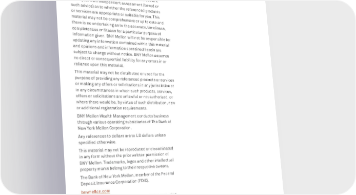 BNY MELLON ENTERPRISE ESG 121 APPENDIX does not constitute a recommendation or advice by BNY Mellon of any kind. Use of our products and services is subject to various regulations and regulatory oversight. You should discuss this material with appropriate advisors in the context of your circumstances before acting in any manner on this material or agreeing to use any of the referenced products or services and make your own independent assessment (based on such advice) as to whether the referenced products or services are appropriate or suitable for you. This material may not be comprehensive or up to date and there is no undertaking as to the accuracy, timeliness, completeness or fitness for a particular purpose of information given. BNY Mellon will not be responsible for updating any information contained within this material and opinions and information contained herein are subject to change without notice. BNY Mellon assumes no direct or consequential liability for any errors in or reliance upon this material. This material may not be distributed or used for the purpose of providing any referenced products or services or making any offers or solicitations in any jurisdiction or in any circumstances in which such products, services, offers or solicitations are unlawful or not authorized, or where there would be, by virtue of such distribution, new or additional registration requirements. BNY Mellon Wealth Management conducts business through various operating subsidiaries of The Bank of New York Mellon Corporation. Any references to dollars are to US dollars unless specified otherwise. This material may not be reproduced or disseminated in any form without the prior written permission of BNY Mellon. Trademarks, logos and other intellectual property marks belong to their respective owners. The Bank of New York Mellon, member of the Federal Deposit Insurance Corporation (FDIC). bnymellon.com P lease click here for additional information regarding disclaimers and disclosures . © 2022 The Bank of New York Mellon. All rights reserved.