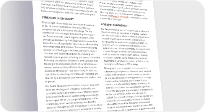 BNY MELLON ENTERPRISE ESG 51 RESPONSIBLE BUSINESS AN INDEPENDENT BOARD The Board of Directors governance framework features well-defined roles and authority with a leadership structure involving an independent Chair, separate from our CEO, Todd Gibbons, who serves as the only non-independent member of the Board. Independent directors meet in executive sessions, presided over by our independent Chair, at regularly scheduled Board meetings. Our CGNSR Committee and Board evaluate this structure annually, or more frequently as needed, to help ensure alignment with the needs of the company. STRENGTH IN DIVERSITY The strength of our Board is a product of the variety of our directors’ experience, diversity, differing perspectives and institutional knowledge. We are committed to fostering and maintaining diversity on our Board: diversity is an integral component of the process undertaken by the CGNSR Committee and the Board for recruiting director candidates and evaluating the composition of the Board. To capture the benefits inherent in differing perspectives, we seek to include directors with diverse backgrounds, including with respect to race, gender, ethnicity and sexual orientation. Following the election of directors at the 2022 Annual Meeting of Stockholders, 36.4% of our directors are women and an additional 36.4% of our directors are diverse on the basis of race or ethnicity. In addition, four of the six standing committees of the Board are chaired by a director who is diverse on the basis of race or gender. Our Board has a well-established focus on long-term business strategy and resiliency, leadership, and corporate culture and performance. This foundation positioned the Board to oversee and provide insight to management on the company’s response to the challenges, uncertainties and opportunities that occurred throughout 2021, including as it relates to our impact on our communities and society more broadly. In addition to the regular updates on the financial and operational impacts of the pandemic on our business, employees, clients and suppliers, the Board maintained a regular dialogue with management in 2021 regarding its direction and action on matters related to social justice, diversity and inclusion, and public policy and advocacy. More information about our Board of Directors is included in our 2022 Proxy Statement . EXECUTIVE COMPENSATION Our executive compensation program is structured to drive results over the long term. At target, 75% of our CEO’s incentive compensation and generally 70% of our other senior executives’ incentive compensation is delivered in equity awards, with the balance paid in cash. We pay bonuses and incentives based on performance against goals, including those on specified environmental, social and governance topics, such as diversity, equity and inclusion and risk management. See our 2022 Proxy Statement for our full compensation discussion and analysis. INVESTOR ENGAGEMENT Our Corporate Governance, Enterprise ESG and Investor Relations teams are committed to engaging regularly with our top investors. We offer meetings on governance issues between top investors and Board members and track the discussions and outcomes. In 2021, our analysts and executives met with broader investor audiences in our offices and virtually. Management and investor dialogue increased as we addressed topics such as executive compensation, company strategy and response to the COVID-19 pandemic, corporate governance, diversity and inclusion, and other issues relating to our Enterprise ESG strategy. Management reports regularly to the independent directors regarding investor discussions and feedback to keep them informed of stockholders’ perspectives on a variety of issues, including governance, strategy, climate and performance, and to enable them to consider and address those matters effectively. For example, stockholder feedback played a significant role in the design and implementation of a stockholder written consent right. It has also informed the CGNSR Committee’s oversight of climate-related and environmental sustainability matters, and helped shaped the focus of the Company’s initiatives and impact in a number of areas. Additionally, when BNY Mellon executed a resegmentation of our business and reclassification on the consolidated income statement during 2021, we kept investors informed of its impact on their ability to conduct year-over-year comparisons of our performance.