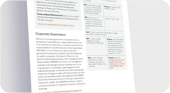 BNY MELLON ENTERPRISE ESG 49 RESPONSIBLE BUSINESS 2021 ACHIEVEMENTS Stockholder Engagement: Reached out to stockholders representing over 65% of the company’s outstanding shares. Diverse Board: One of the most diverse Boards on Wall Street, with 36.4% women and 36.4% from underrepresented ethnic/racial backgrounds, making our Board over 72% diverse on the basis of gender, race and ethnicity. * Focus on Board Refreshment: Seven of our current directors have been appointed to the Board within the last five years. * Notice of Annual Meeting and Proxy Statement 2022 . Corporate Governance Effective corporate governance is foundational to a prosperous, sustainable and responsible business, and it can profoundly impact how a company approaches its responsibilities to stockholders and other stakeholders. BNY Mellon is committed to a robust corporate governance framework consistent with best practices for public companies. Our Board of Directors, the Board’s Corporate Governance, Nominating and Social Responsibility (CGNSR) Committee, and management evaluate corporate governance developments on an ongoing basis, including through engagement with stakeholder groups, to identify and, where appropriate, implement changes to align with best practices as they evolve. As described below, the Board and the CGNSR Committee have been active in refining our governance framework. In 2021, the CGNSR Committee, which is composed entirely of independent directors, held seven meetings. As a signatory to the Commonsense Principles 2.0 , we embrace corporate governance principles for sound, long-term-oriented governance. Similarly, our endorsement of the Business Roundtable’s Statement on the Purpose of the Corporation signals our commitment to our stakeholders in our pursuit of improving our business performance. Enterprise ESG 2025 Governance Goals Goal: As part of the director recruitment and refreshment efforts for the parent Board of Directors, continue to ensure that candidate slates include individuals with diverse backgrounds and perspectives in order to maintain the Board’s diverse composition KPI: Review at least annually the diversity criteria applied by the Board in its process of evaluating the qualifications of potential candidates Progress: Completed for 2021 evaluation process KPI: Integrate into the evaluation of external search firms’ performance a review of such firms’ capabilities in developing diverse candidate pools New KPI initiated in 2021 Goal: Formalize proactive outreach program to engage stockholders on ESG performance KPI: Increase proactive engagement with top stockholders on ESG topics Progress: In 2021, BNY Mellon reached out to stockholders representing over 65% of the company’s outstanding shares and held discussions, including with respect to ESG topics, with those that accepted our invitation KPI: Enhance integration of ESG content in public reporting, including but not limited to BNY Mellon’s Proxy materials Progress: Please see Oversight of Environmental, Social and Governance Matters section of the 2022 Proxy Statement, pages 31-35