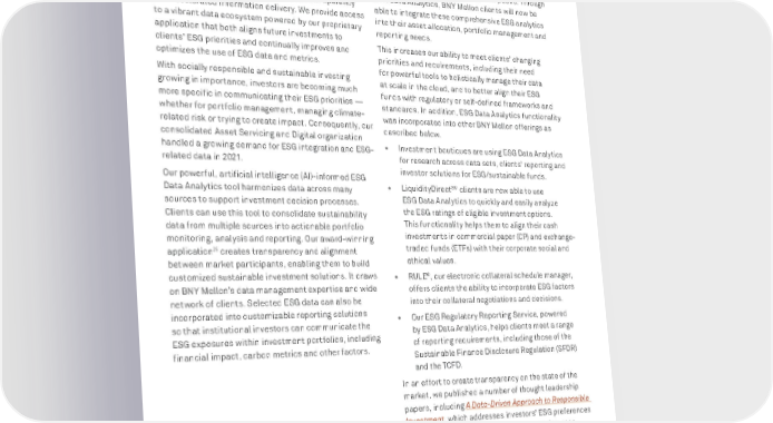 BNY MELLON ENTERPRISE ESG 60 RESPONSIBLE BUSINESS Asset Servicing and Digital As the “bank of banks,” we power the financial industry through our unique perspective, informed by one of the largest data sets in the world. Our consolidated Asset Servicing and Digital capabilities are transforming investment management with increased transparency and accelerated information delivery. We provide access to a vibrant data ecosystem powered by our proprietary application that both aligns future investments to clients’ ESG priorities and continually improves and optimizes the use of ESG data and metrics. With socially responsible and sustainable investing growing in importance, investors are becoming much more specific in communicating their ESG priorities — whether for portfolio management, managing climate- related risk or trying to create impact. Consequently, our consolidated Asset Servicing and Digital organization handled a growing demand for ESG integration and ESG- related data in 2021. Our powerful, artificial intelligence (AI)-informed ESG Data Analytics tool harmonizes data across many sources to support investment decision processes. Clients can use this tool to consolidate sustainability data from multiple sources into actionable portfolio monitoring, analysis and reporting. Our award-winning application 25 creates transparency and alignment between market participants, enabling them to build customized sustainable investment solutions. It draws on BNY Mellon’s data management expertise and wide network of clients. Selected ESG data can also be incorporated into customizable reporting solutions so that institutional investors can communicate the ESG exposures within investment portfolios, including financial impact, carbon metrics and other factors. 25 Best New Technology Introduced over the Last 12 Months (AI, machine learning and analytics), American Financial Technology Awards 2020; Technology Innovation of the Year, Global Investment Group Excellence Awards 2020 . EXPANDING OUR ESG DATA ANALYTICS TOOL We further enhanced the BNY Mellon ESG Data Analytics tool by integrating additional data sources, including proprietary ESG and climate intelligence from firms who have made their role in the ecosystem public. Through ESG Data Analytics, BNY Mellon clients will now be able to integrate these comprehensive ESG analytics into their asset allocation, portfolio management and reporting needs. This increases our ability to meet clients’ changing priorities and requirements, including their need for powerful tools to holistically manage their data at scale in the cloud, and to better align their ESG funds with regulatory or self-defined frameworks and standards. In addition, ESG Data Analytics functionality was incorporated into other BNY Mellon offerings as described below. • Investment boutiques are using ESG Data Analytics for research across data sets, clients' reporting and investor solutions for ESG/sustainable funds. • LiquidityDirect SM clients are now able to use ESG Data Analytics to quickly and easily analyze the ESG ratings of eligible investment options. This functionality helps them to align their cash investments in commercial paper (CP) and exchange- traded funds (ETFs) with their corporate social and ethical values. • RULE ® , our electronic collateral schedule manager, offers clients the ability to incorporate ESG factors into their collateral negotiations and decisions. • Our ESG Regulatory Reporting Service, powered by ESG Data Analytics, helps clients meet a range of reporting requirements, including those of the Sustainable Finance Disclosure Regulation (SFDR) and the TCFD. In an effort to create transparency on the state of the market, we published a number of thought leadership papers, including A Data-Driven Approach to Responsible Investment , which addresses investors’ ESG preferences and the data required to support these preferences. We also aimed at demystifying climate risk scenario analysis with Helping Investors Understand Climate Risk , a practical case study. Both papers reflect our ESG investor community focus where experimentation and sharing are encouraged.