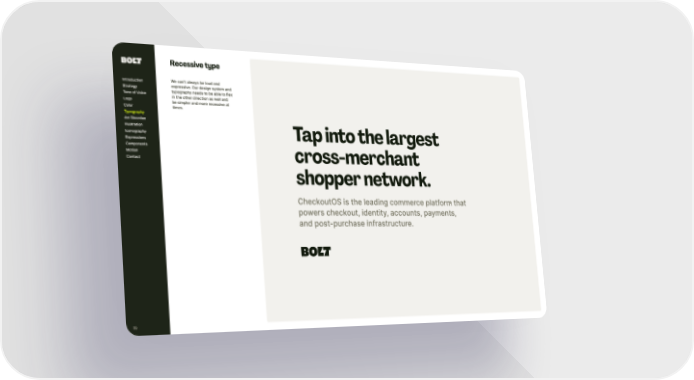 70 Recessive type Tap into the largest cross-merchant shopper network. CheckoutOS is t he leading commerce platform t hat powers checkout, identity, accounts, payments, and post-purchase infrastructure. We can’ t always be loud and expressive. Our design system and typography needs to be able to flex in t he ot her direction as well and be simpler and more recessive at times. Introduction Strategy Tone of Voice Logo Color Ar t Direction Illustration Iconography Expressions Components Motion Contact Typography