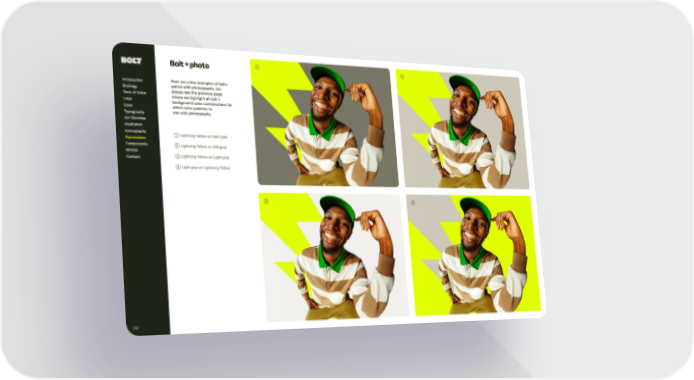 ➀ Lightning Yellow on Dark gray ➁ Lightning Yellow on Mid gray ➂ Lightning Yellow on Light gray ➃ Light gray on Lightning Yellow ➀ ➁ ➂ ➃ Introduction Strategy Tone of Voice Logo Color Typography Ar t Direction Illustration Iconography Components Motion Contact Expressions 122 Bolt + photo Here are a few examples of bolts paired wit h photographs, but please see t he previous page where we highlight all bolt + background color combinations for which color palettes to use wit h photography.