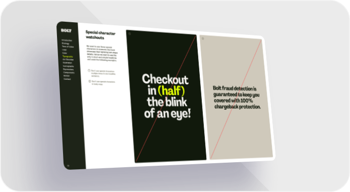 Bolt fraud detection is guaranteed to keep you covered with 100% chargeback protection. Checkout in the blink of an eye! (half) ➀ ➁ 79 ➀ Don’ t use special characters multiple times in one headline sentence. ➁ Don’ t use special characters in body copy. Special character watchout s We want to use t hese special characters in moments t hat best showcase t heir lightning bolt shape details. Hence we want to use t he only in shor t and simple headlines and avoid t he following examples. Introduction Strategy Tone of Voice Logo Color Ar t Direction Illustration Iconography Expressions Components Motion Contact Typography