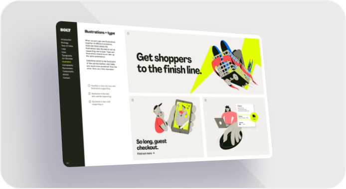 So long, guest checkout. Find out more Get shoppers to the finish line. ➂ ➀ ➁ ➀ Headline is more t he hero wit h illustrations suppor ting. ➁ Illustration is t he hero wit h subtit le suppor ting. ➂ Illustration is hero wit h suppor ting ui. Introduction Strategy Tone of Voice Logo Color Typography Ar t Direction Iconography Expressions Components Motion Contact Illustration 101 Illustrations + type When we pair type and illustrations toget her in different occasions, t here are times where t he illustrations take t he lead or act as suppor ting role to type. Type and illustrations should never take up t he same prominence. Determine which is t he focal point of t he communication, and make one much more prominent t han t he ot her. Here are a few examples: