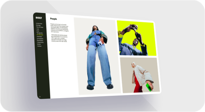 85 Introduction Strategy Tone of Voice Logo Color Typography Illustration Iconography Expressions Components Motion Contact Ar t Direction People People are t he hear t of t he Bolt brand. Representing shoppers and merchants alike, our photography subjects should be as diverse and inclusive as our platform, energetic and expressive. Their poses and actions should lend t hemselves to our dynamic wide angle style, creating movement t hrough t he image, drawing users into t heir world.