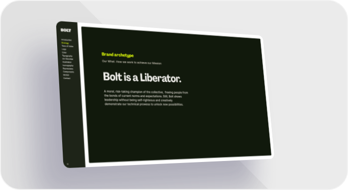 A moral, risk-taking champion of t he collective, freeing people from t he bonds of current norms and expectations. Still, Bolt shows leadership wit hout being self-righteous and creatively demonstrate our technical prowess to unlock new possibilities. Bolt is a Liberator. 10 Brand archetyp e Our What. How we work to achieve our Mission Introduction Tone of Voice Logo Color Typography Ar t Direction Illustration Iconography Expressions Components Motion Contact Strategy