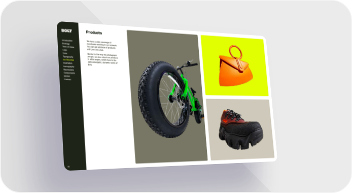 90 Introduction Strategy Tone of Voice Logo Color Typography Illustration Iconography Expressions Components Motion Contact Ar t Direction Product s We have a wide coverage of merchants working in our network. You can get all kinds of products wit h just one click. Similar to t he way we photograph people, we also shoot our products in wide angles, which lives in t he same energetic, dynamic world of Bolt.