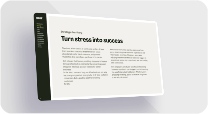 Turn stress into success Checkout often causes e-commerce anxiety. A less t han seamless checkout experience can cause abandoned car ts, fraud concerns, and general frustration t hat can stop a purchase in its tracks. Bolt relieves t hat burden, enabling shoppers to breeze t hrough checkout and consistent ly conver ting guest shoppers into loyal account holders for better business in t he shor t term and long run. Checkout can not only become your greatest strengt h for first-time customer conversion, but a star ting point for creating customers for life. Merchants worr y less, learning from more first- par ty data to improve customer experiences and t heir results over time. Shoppers worr y less, enjoying t he effor t lessness of a secure, logged-in experience across more merchants and purchasing wit h confidence. Bolt empowers a mutually beneficial relationship between merchants and shoppers, not inter vening like a self interested middleman. Whet her you ’re shopping or selling, Bolt is built better for you — a win-win, all around. 12 Strategic territory Introduction Tone of Voice Logo Color Typography Ar t Direction Illustration Iconography Expressions Components Motion Contact Strategy
