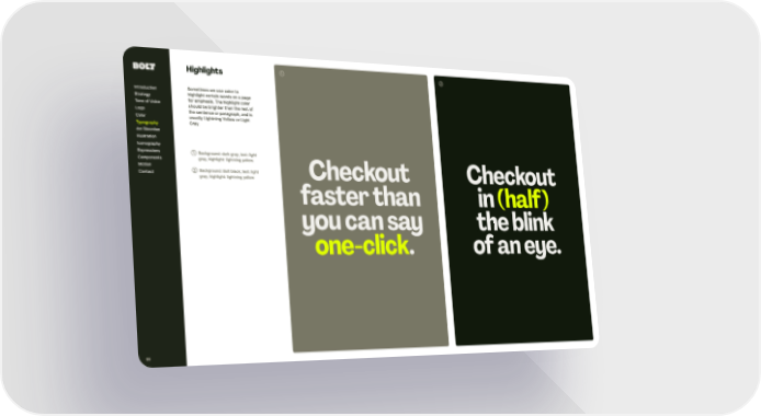 66 Highlight s Checkout faster than you can say . one-click Checkout in the blink of an eye. (half) ➀ ➁ Sometimes we use color to highlight cer tain words on a page for emphasis. The highlight color should be brighter t han t he rest of t he sentence or paragraph, and is usually Lightning Yellow or Light Gray. ➀ Background: dark gray, text: light gray, highlight: lightning yellow. ➁ Background: Bolt black, text: light gray, highlight: lightning yellow Introduction Strategy Tone of Voice Logo Color Ar t Direction Illustration Iconography Expressions Components Motion Contact Typography
