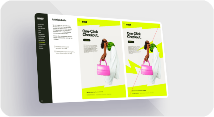 One-Click Checkout. One-Click Checkout. Lorem ipsum dolor sit amet, consectetur adipiscing elit. Nulla diam ligula, hendrerit vitae hendrerit vitae, ultricies a tor tor. Vestibulum ante ipsum primis in faucibus orci luctus et ultrices posuere cubilia curae. Nulla turpis tor tor, consequat eget nulla sed, ultrices mattis augue. Proin et placerat lorem. Lorem ipsum dolor sit amet, consectetur adipiscing elit. Nulla diam ligula, hendrerit vitae hendrerit vitae, ultricies a tor tor. Vestibulum ante ipsum primis in faucibus orci luctus et ultrices posuere cubilia curae. Nulla turpis tor tor, consequat eget nulla sed, ultrices mattis augue. Proin et placerat lorem. Get Star ted Get Star ted ➀ ➁ 588 Sutter Street, San Francisco, CA 94102 588 Sutter Street, San Francisco, CA 94102 © 2021 Bolt Financial, Inc. © 2021 Bolt Financial, Inc. Update Preference Update Preference Terms of Use Terms of Use Privacy Policy Privacy Policy ➀ Bolt shapes on far top and far bottom, t his is okay. ➁ Too many bolt shapes close toget her, and all different types. Not okay. Introduction Strategy Tone of Voice Logo Color Typography Ar t Direction Illustration Iconography Components Motion Contact Expressions 128 Multiple bolt s We tr y to only use one bolt shape per execution, but if you are using multiple bolt shapes in one ver y tall or long execution, for example in a tall email, make sure t hat t hey are not too close to one anot her. Always allow ample space between shapes to ensure t hey don’ t get too crowded.