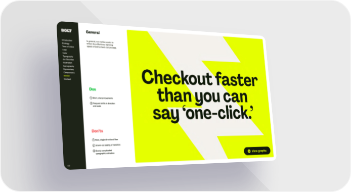 Dos ➀ Shor t, sharp movements ➁ Frequent shifts in direction and scale Don’t s ➀ Slow, single directional flow ➁ Drawn-out easing of transition ➂ Overly complicated typographic animation General In general, our motion wants to reflect t he effor t less, lightning speed of Bolt ’s check out process. Introduction Strategy Tone of Voice Logo Color Typography Ar t Direction Illustration Iconography Expressions Components Contact Motion 136 View graphic