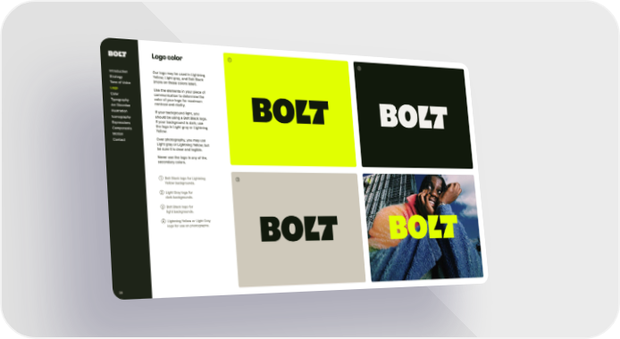 38 Logo color ➀ ➁ ➂ ➃ ➀ Bolt Black logo for Lightning Yellow backgrounds. ➁ Light Gray logo for dark backgrounds. ➂ Bolt Black logo for light backgrounds. ➃ Lightning Yellow or Light Gray logo for use on photographs. Our logo may be used in Lightning Yellow, Light gray, and Bolt Black (more on t hese colors later). Use t he elements in your piece of communication to determine t he color of your logo for maximum contrast and clarity. If your background light, you should be using a Bolt Black logo. If your background is dark, use t he logo in Light gray or Lightning Yellow. Over photography, you may use Light gray or Lightning Yellow, but be sure it is clear and legible. Never use t he logo in any of t he secondar y colors. Introduction Strategy Tone of Voice Color Typography Ar t Direction Illustration Iconography Expressions Components Motion Contact Logo