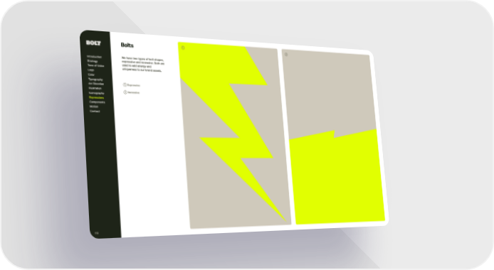 ➀ ➁ ➀ Expressive ➁ Recessive Introduction Strategy Tone of Voice Logo Color Typography Ar t Direction Illustration Iconography Components Motion Contact Expressions 113 Bolt s We have two types of bolt shapes, expressive and recessive. Bot h are used to add energy and uniqueness to our brand assets.