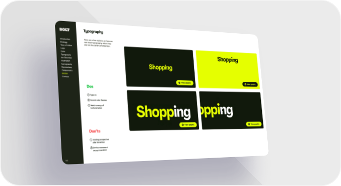 View graphic View graphic Dos ➀ Type on ➁ Accent color flashes ➂ Match energy of bolt animation Don’t s ➀ Holding perspective after transition ➁ Device movement except transition Typography Here are a few options on how we can treat typography when t hey are not t he centre of attention. Introduction Strategy Tone of Voice Logo Color Typography Ar t Direction Illustration Iconography Expressions Components Contact Motion 143 View graphic View graphic