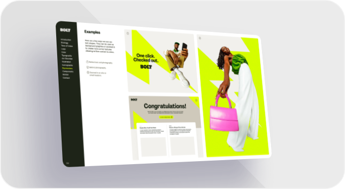 One click. Checked out. Need help? Get answers here. Bolt One Click is now connec ted to your BigCommerce store. There are a few more steps you’ll need to take in your BigCommerce dashboard to ensure a successful integration. C o n g rat u l at i o n s ! Go back to BigCommerce ➂ Bolt One Click is now connec ted to your BigCommerce store. There are a few more steps you’ll need to take in your BigCommerce dashboard to ensure a successful integration. C o n g rat u l at i o n s ! Go back to BigCommerce S T E P 1 D i s a b l e O t h e r C re d i t C a rd F i e l d s For your customer to have a streamlined, attrac tive experience inputting their credit card infor mation, disable any another credit card payment fields. Full guide. S T E P 2 R e q u i re a S h o p p e r P h o n e N u m b e r For guest shoppers to effec tively create a Bolt account and leverage Bolt ’s One Click experience during their subsequent purchases, set the phone number field as required. Full guide. ➀ Behind text and photography ➁ Behind photography. ➂ Zoomed in on site or email headers. ➀ ➁ Introduction Strategy Tone of Voice Logo Color Typography Ar t Direction Illustration Iconography Components Motion Contact E xpressions 124 Ex a mp les H ere are a fe w w ays w e use our b olt shapes. They can b e used as b ac k ground graphics or z oomed in to create more corner textures allo w ing w ritten content to shine.
