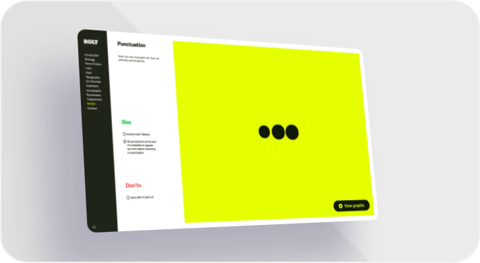 Dos ➀ Accent color flashes ➁ All punctuation at t he end of a headline to appear as a line before resolving in punctuation Don’t s ➀ Slow shift in and out Punctuation Here are two examples for how we animate punctuations. Introduction Strategy Tone of Voice Logo Color Typography Ar t Direction Illustration Iconography Expressions Components Contact Motion 144 View graphic