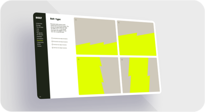 ➀ Horizontal two edge recessive ➁ Horizontal one edge recessive ➂ Ver tical two edge recessive ➃ Ver tical one edge recessive ➀ ➁ ➂ ➃ Introduction Strategy Tone of Voice Logo Color Typography Ar t Direction Illustration Iconography Components Motion Contact Expressions 126 Bolt + type Recessive bolts come in bot h ver tical and horizontal formats. The amount of sharp drops per edge can differ from 1-3 but should never get more jagged as t hey star t not to look like bolts.