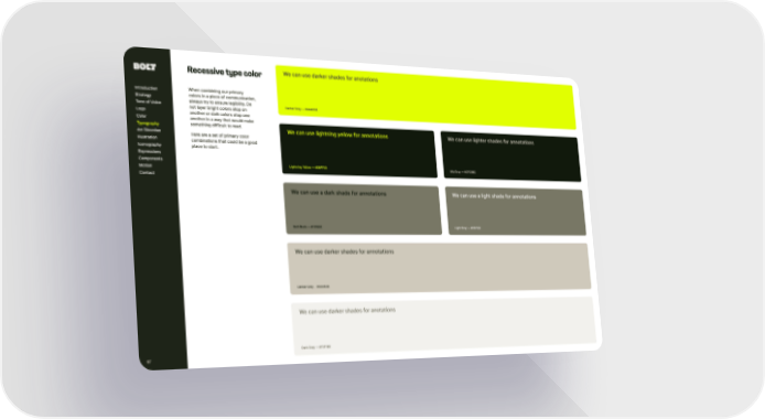 67 Recessive type color We can use darker shades for anotations We can use lightning yellow for annotations We can use lighter shades for annotations We can use a dark shade for annotations We can use darker shades for annotations We can use darker shades for anotations We can use a light shade for annotations Lightning Yellow — #E6FF00 Darker Gray — #444638 Mid Gray — #CFC9BC Bolt Black — #11190C Darker Gray— #444638 Dark Gray — #F3F1EE Light Gray — #F3F1EE When combining our primar y colors in a piece of communication, always tr y to ensure legibility. Do not layer bright colors atop on anot her or dark colors atop one anot her in a way t hat would make somet hing difficult to read. Here are a set of primar y color combinations t hat could be a good place to star t. Introduction Strategy Tone of Voice Logo Color Ar t Direction Illustration Iconography Expressions Components Motion Contact Typography
