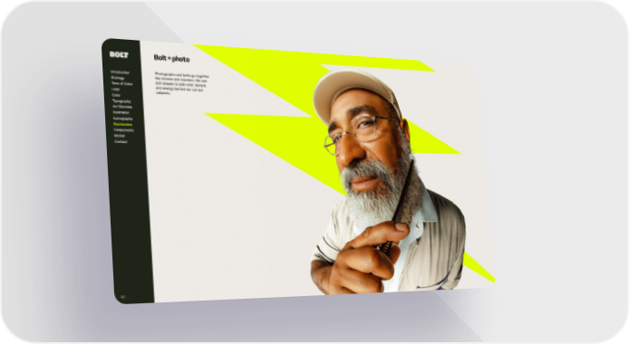 Introduction Strategy Tone of Voice Logo Color Typography Ar t Direction Illustration Iconography Components Motion Contact Expressions 121 Bolt + photo Photographs and bolts go toget her like cheese and crackers. We use bolt shapes to add color, texture and energy behind our cut out subjects.