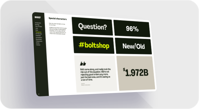 Question? #b olt shop 96% New/Old “ 1.972B $ 78 Special characters Here are a few examples on how we use t hem. Usually we use t hem wit h t he same size as t he tit les. In some special occasions, we can play wit h t he scale of t he special characters to create more memorable visuals. Bolt came along, and really took the risk out of the equation. We’re not rejecting good orders any more, just the bad ones, and it’s saving us a ton of time. Introduction Strategy Tone of Voice Logo Color Ar t Direction Illustration Iconography Expressions Components Motion Contact Typography
