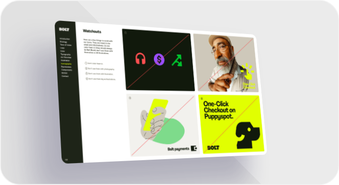 One-Click Checkout One-Click Checkout on Puppyspot. Bolt payments ➀ Don’ t color t hem in. ➁ Don’ t use t hem wit h photography. ➂ Don’ t use t hem wit h illustration. ➃ Don’ t use t hem big as illustrations. ➀ ➁ ➂ ➃ Introduction Strategy Tone of Voice Logo Color Typography Ar t Direction Illustration Expressions Components Motion Contact Iconography 108 Watchout s Here are a few t hings to avoid wit h our icons. They are meant to be small and informatively. Do not color t hem in (t hey should always be Bolt Black) don’ t use t hem wit h illustration or AS illustrations.