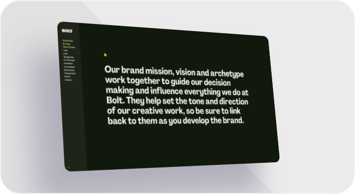 5 Introduction Tone of Voice Logo Color Typography Ar t Direction Illustration Iconography Expressions Components Motion Contact Strategy 5 Our brand mission, vision and archetyp e work together to guide our decision making and inf luenc e everything we do at Bolt. They help set the tone and direction of our creative work, so b e sure to link back to them as you develop the brand.