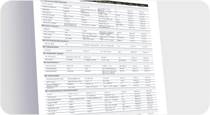 THE BRAKE ROOM CHICK-FIL-A CHICK-FIL-A McCANN, New York USA SILVER LION SILVER LION D04 (Sponsorship & Brand Partnership) FIFA 23 X TED LASSO EA SPORTS & APPLE FIFA 23 X TED LASSO APPLE, Cupertino / EA SPORTS, Redwood City USA GRAND PRIX GRAND PRIX THE HIGH STAKES BEER AD BLUE MOON COORS LIGHT, MILLER LITE & BLUE MOON DROGA5, PART OF ACCENTURE SONG, New York USA BRONZE LION BRONZE LION BUNDY MIXER BUNDABERG BUNDABERG RUM LEO BURNETT, Sydney AUSTRALIA SILVER LION SILVER LION CERTIFIED CARE RAID SC JOHNSON / RAID ENERGY BBDO, Chicago USA SILVER LION SILVER LION OREO CHEAT COOKIES MONDELEZ EUROPE OREO SAATCHI & SAATCHI, Dusseldorf GERMANY BRONZE LION BRONZE LION EAT LIKE A CHAMP PEDIDOS YA PEDIDOS YA GUT, Buenos Aires ARGENTINA SILVER LION SILVER LION THE LAST PHOTO ITV X CALM ITV X CALM adam&eveDDB, London UNITED KINGDOM GOLD LION GOLD LION DOGS WITHOUT BORDERS SFBO FRENCH-BRAZILIAN SOCIETY OF ONCOLOGY) KDOG CANCER DETECT GROUP VMLY&R, New York / VMLY&R, Sao Paulo / VMLY&R, Madrid USA BRONZE LION BRONZE LION D05 (Launch / Re-launch) HEINEKICKS HEINEKEN HEINEKEN BBH SINGAPORE / PUBLICIS ITALY | LEPUB, Milan / BBH SINGAPORE SINGAPORE BRONZE LION BRONZE LION AIRTEL 175 REPLAYED AIRTEL AIRTEL TELECOMMUNICATIONS LEO BURNETT, Mumbai INDIA GOLD LION GOLD LION SMART PLANTS PLANT DROP PLANT DROP: ECOMMERCE HOUSE PLANT RETAIL McCANN, London / McCANN HEALTH, London UNITED KINGDOM SILVER LION SILVER LION HEAVEN FISH REGAL SPRING FARMED FISH FOR EXPORT OGILVY HONDURAS, Tegucigalpa HONDURAS SILVER LION SILVER LION D06 (360 Integrated Brand Experience ) TIDE LUCKY JERSEY TIDE TIDE HYGIENIC CLEAN POWER PODS SAATCHI & SAATCHI, New York USA SILVER LION SILVER LION E02 (Challenger Brand) PETRA MILK PETRA BEER PETRA BEER BETC HAVAS, Sao Paulo BRAZIL BRONZE LION BRONZE LION E03 (Single-market Campaign) THE TAX FREE BAGEL PHILADELPHIA CREAM CHEESE CREAM CHEESE GUT, Miami USA BRONZE LION BRONZE LION MAYO MCHACK HELLMANN'S HELLMANN'S MAYONNAISE EDELMAN, London UNITED KINGDOM SILVER LION SILVER LION E04 (Social Behaviour) RAISE YOUR ARCHES MCDONALD'S MCDONALD'S LEO BURNETT, London UNITED KINGDOM SILVER LION SILVER LION THE POSTPONED DAY LALCEC LALCEC GREY ARGENTINA, Buenos Aires ARGENTINA SILVER LION SILVER LION SCROLLING THERAPY EUROFARMA EUROFARMA DENTSU CREATIVE, Buenos Aires / DENTSU CREATIVE, New York / DENTSU CREATIVE, Chicago ARGENTINA BRONZE LION BRONZE LION E05 (Cultural Insight) PORTUGUESE (RE)CONSTITUTION PENGUIN RANDOM HOUSE PENGUIN BOOKS FCB LISBON PORTUGAL SILVER LION SILVER LION ANNE DE GAULLE FONDATION ANNE DE GAULLE ASSOCIATION HAVAS PARIS FRANCE BRONZE LION BRONZE LION ADLAM - AN ALPHABET TO PRESERVE A CULTURE MICROSOFT MICROSOFT 365 McCANN, New York USA GOLD LION GOLD LION HEAVEN FISH REGAL SPRING FARMED FISH FOR EXPORT OGILVY HONDURAS, Tegucigalpa HONDURAS GOLD LION GOLD LION E07 (Corporate Purpose & Social Responsibility) R PLATES MYCAR TYRE & AUTO MYCAR TYRE & AUTO TBWA\SYDNEY AUSTRALIA BRONZE LION BRONZE LION CERTIFIED CARE RAID SC JOHNSON / RAID ENERGY BBDO, Chicago USA GOLD LION GOLD LION ARE YOU PRESS WORTHY? COLUMBIA JOURNALISM REVIEW COLUMBIA JOURNALISM REVIEW TBWA\CHIAT\DAY, New York City USA BRONZE LION BRONZE LION PASSIVE COOKING BARILLA BARILLA PUBLICIS ITALY | LEPUB, Milan ITALY BRONZE LION BRONZE LION RUNNER 321 ADIDAS ADIDAS FCB TORONTO CANADA BRONZE LION BRONZE LION SURAKSHA KA TEEKA MORTEIN PRODUCT DENTSU CREATIVE, Gurgaon INDIA BRONZE LION BRONZE LION THE LAST PHOTO ITV X CALM ITV X CALM adam&eveDDB, London UNITED KINGDOM SILVER LION SILVER LION SEE MY SKIN VASELINE VASELINE EDELMAN, New York USA SILVER LION SILVER LION E08 (Market Disruption) THE CLOSER HEINEKEN HEINEKEN PUBLICIS ITALY | LEPUB, Milan ITALY SILVER LION SILVER LION Title Brand Product / Service Entrant / Idea Creation Location Prize Award