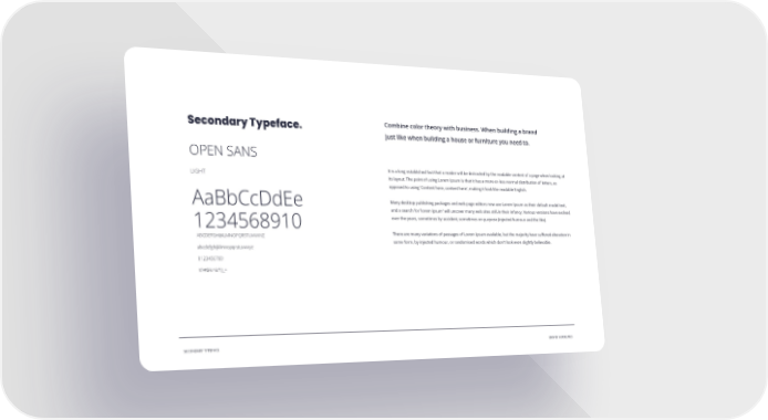Combine color theory with business. When building a brand Secondary Typeface. just like when building a house or furniture you need to. OPEN SANS It is a long established fact that a reader will be distracted by the readable content of a page when looking at LIGHT its layout. The point of using Lorem Ipsum is that it has a more-or-less normal distribution of letters, as opposed to using 'Content here, content here', making it look like readable English. Many desktop publishing packages and web page editors now use Lorem Ipsum as their default model text, AaBbCcDdEe and a search for 'lorem ipsum' will uncover many web sites still in their infancy. Various versions have evolved over the years, sometimes by accident, sometimes on purpose (injected humour and the like). 1234568910 There are many variations of passages of Lorem Ipsum available, but the majority have suļ¬ered alteration in ABCDEFGHIJKLMNOPQRSTUVWXYZ some form, by injected humour, or randomised words which don't look even slightly believable. abcdefghijklmnopqrstuvwxyz 0123456789 !@#$%^&*()_+ SECONDARY TYPEFACE BRAND GUIDELINES