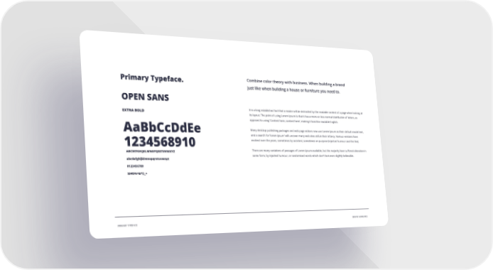 Combine color theory with business. When building a brand Primary Typeface. just like when building a house or furniture you need to. OPEN SANS It is a long established fact that a reader will be distracted by the readable content of a page when looking at EXTRA BOLD its layout. The point of using Lorem Ipsum is that it has a more-or-less normal distribution of letters, as opposed to using 'Content here, content here', making it look like readable English. Many desktop publishing packages and web page editors now use Lorem Ipsum as their default model text, AaBbCcDdEe and a search for 'lorem ipsum' will uncover many web sites still in their infancy. Various versions have evolved over the years, sometimes by accident, sometimes on purpose (injected humour and the like). 1234568910 There are many variations of passages of Lorem Ipsum available, but the majority have suļ¬ered alteration in ABCDEFGHIJKLMNOPQRSTUVWXYZ some form, by injected humour, or randomised words which don't look even slightly believable. abcdefghijklmnopqrstuvwxyz 0123456789 !@#$%^&*()_+ PRIMARY TYPEFACE BRAND GUIDELINES