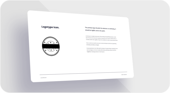 The primary logo shouldn’t be abstract or confusing, it Logotype Icon. should be legible and to the point. Lorem Ipsum is simply dummy text of the printing and typesetting industry. Lorem Ipsum has been the industry's standard dummy text ever since the 1500s, when an unknown printer took a galley of type and scrambled it to make a type specimen book. It has survived not only five centuries, but also the leap into electronic typesetting, remaining essentially unchanged. It was popularised in the 1960s with the release of Letraset sheets containing Lorem Ipsum passages, and more recently with desktop publishing software like Aldus PageMaker including versions of Lorem Ipsum. LOGOTYPE ICON BRAND GUIDELINES