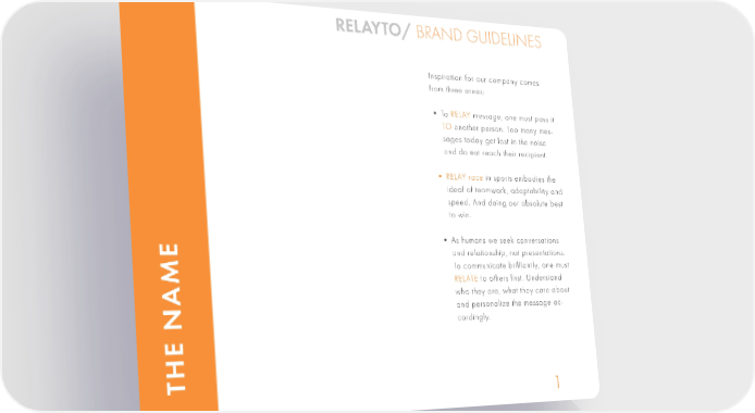 RELAYTO/ BRAND GUIDELINES Inspiration for our company comes from three areas: • To RELAY message, one must pass it TO another person. Too many mes- sages today get lost in the noise and do not reach their recipient. • RELAY race in sports embodies the ideal of teamwork, adaptability and speed. And doing our absolute best to win. • As humans we seek conversations and relationship, not presentations. To communicate brilliantly, one must RELATE to others first. Understand who they are, what they care about and personalize the message ac- cordingly. THE NAME 1