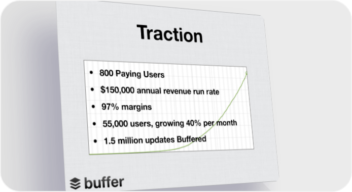 Buffer: The pitch deck used to raise $500,000 Page 8 Page 10Traction • 800 Paying Users • $150,000 annual revenue run rate • 97% margins • 55,000 users, growing 40% per month • 1.5 million updates Buffered