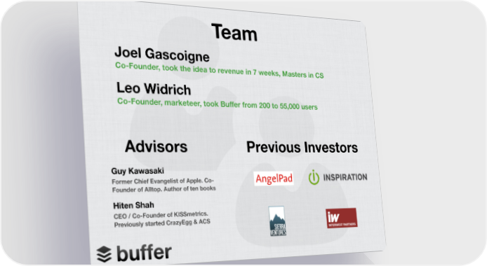 Team Joel Gascoigne Co-Founder, took the idea to revenue in 7 weeks, Masters in CS Leo Widrich Co-Founder, marketeer, took Buffer from 200 to 55,000 users Advisors Previous Investors Guy Kawasaki Former Chief Evangelist of Apple. Co- Founder of Alltop. Author of ten books Hiten Shah CEO / Co-Founder of KISSmetrics. Previously started CrazyEgg & ACS