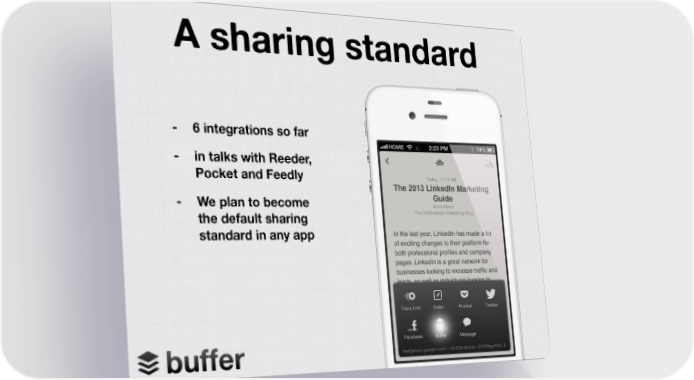 Buffer: The pitch deck used to raise $500,000 Page 13 Page 15A sharing standard - 6 integrations so far - in talks with Reeder, Pocket and Feedly - We plan to become the default sharing standard in any app