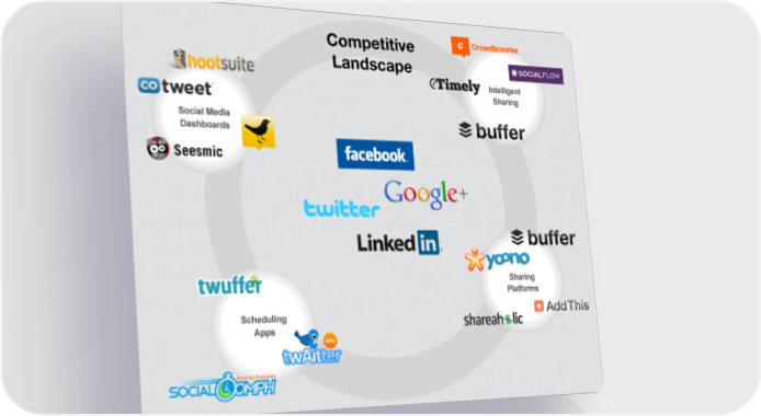 Competitive Landscape Competition • Dashboards: Hootsuite, CoTweet, TweetDeck, Seesmic • Intelligent sharing: CrowdBooster, SocialFlow, Timely, Buffer • Publishers: Shareaholic, AddThis, yoono, Buffer • Scheduling apps: SocialOomph, Twaitter, LaterBro, Twuffer • Our differentiation: a platform approach