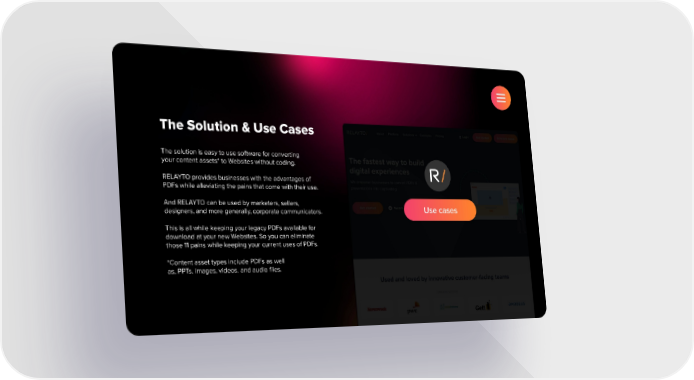 The Solution & Use Cases The solution is easy to use software for converting your content assets* to Websites without coding. RELAYTO provides businesses with the advantages of PDFs while alleviating the pains that come with their use. And RELAYTO can be used by marketers, sellers, Use cases designers, and more generally, corporate communicators. This is all while keeping your legacy PDFs available for download at your new Websites. So you can eliminate those 11 pains while keeping your current uses of PDFs. *Content asset types include PDFs as well as, PPTs, images, videos, and audio files.