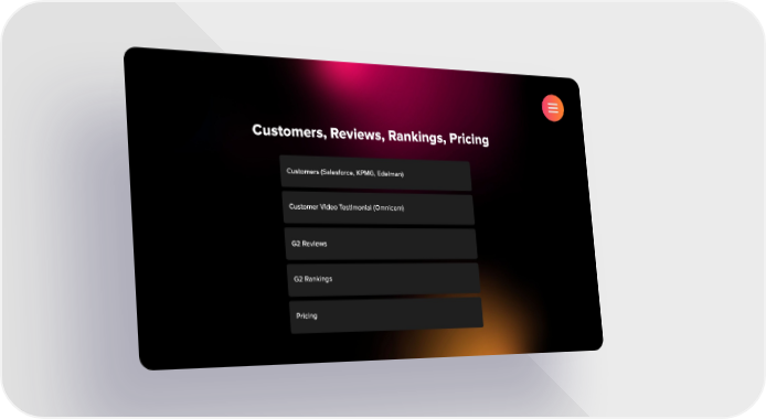 Build Websites in seconds from your PDFs Page 4 Page 6Customers, Reviews, Rankings, Pricing Customers (Salesforce, KPMG, Edelman) Customer Video Testimonial (Omnicom) G2 Reviews G2 Rankings Pricing