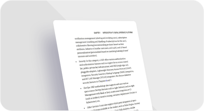 Chapter 1 IntroduCtIon to dIgItal experIenCe platforms notification management (alerting and notifying users), subscription management (enabling and disabling of subscriptions for the user), collaborative filtering (recommending products based on their attributes, behavior of similar customers, and such), and AI-based personalization (personalized based on matching learning of users’ interests and activities). • Security: In this category, a DXP offers various authentication and authorization features such as support for an access control list, public–private key infrastructure, web SSO (single sign-on); pluggable adapters, Lightweight Directory Access Protocol (LDAP) integration, Security Assertion Markup Language (SAML) integration, and NT LAN Manager (NTLM) integration. We discuss elaborate security features in Chapters 6 and 7. • DevOps: DXP methodology also supports and uses various open- source DevOps features such as Agile Delivery (such as Agile Management with Slack or Jira); continuous integration or CI (such as Jenkins); iterative testing; container deployment (Docker or Kubernetes); etc. • Other Services: It can also support third-party integration of open- source features available in the market, such as Rules Engine, Journey Analytics (Google web Analytics, Open Web Analytics, similar web, etc.), Appstore support/integration (Google Playstore/Apple appstore), IoT services (Iotivity), wearable services, and reporting services. Evolution and Drivers for DXP In this section we discuss the various stages of evolution of digital platforms and the key drivers of DXPs. Evolution of Digital Platforms Various stages of evolution of digital platforms are shown in Figure 1-2. 11