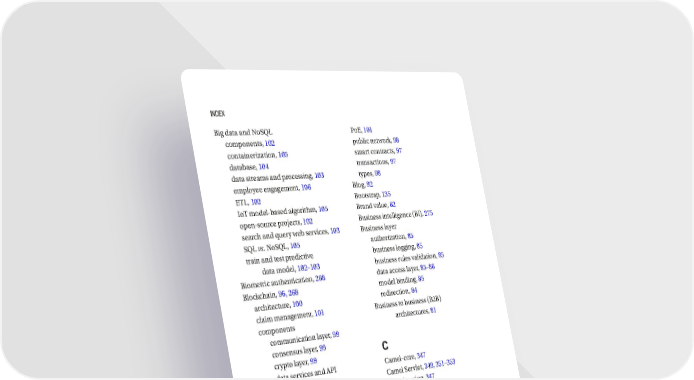 Index Big data and NoSQL PoE, 101 components, 102 public network, 98 containerization, 105 smart contracts, 97 database, 104 transactions, 97 data streams and processing, 103 types, 98 employee engagement, 106 Blog, 92 ETL, 102 Bootstrap, 135 IoT model-based algorithm, 105 Brand value, 62 open-source projects, 102 Business intelligence (BI), 275 search and query web services, 103 Business layer SQL vs. NoSQL, 105 authorization, 85 train and test predictive business logging, 85 data model, 102–103 business rules validation, 85 Biometric authentication, 268 data access layer, 85–86 Blockchain, 96, 268 model binding, 85 architecture, 100 redirection, 84 claim management, 101 Business to business (B2B) components architectures, 81 communication layer, 99 consensus layer, 99 C crypto layer, 99 data services and API Camel-core, 347 managements, 99 Camel Servlet, 349, 351–353 data store layer, 99 Camel-spring, 347 identify services, 99 Camel-stream, 347 smart contract layer, 99 Cascading style sheets (CSS), 124 definition, 96 Centralized access, 201 digital identity, 101 Chatbots, 92 distributed ledger, 97 AI strategy, 107 EHR, 100 bot engine, 107 enterprise network, 98 integration, legacy system, 108 KYC, 100 open-source bot frameworks, 108 letter of credit, 101 presentation layer, 107 libraries, 97 Cloud testing, 211–212 loyalty and rewards, 101 Code backup, 230 network, 97–98 Cold backup option, 231 platforms, 98 Compartmentalization, 201 368