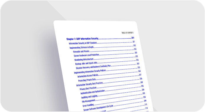 Table of ConTenTs Chapter 7: DXP Information Security �������������������������������������������������������������������� 201 Information Security in DXP Solutions �������������������������������������������������������������������������������������� 201 Implementing Defense in Depth ������������������������������������������������������������������������������������������������ 202 Firewalls and Proxies ���������������������������������������������������������������������������������������������������������� 202 Server Hardware Level Protection ��������������������������������������������������������������������������������������� 202 Monitoring Infrastructure ���������������������������������������������������������������������������������������������������� 202 Backup Jobs and Synch Jobs ���������������������������������������������������������������������������������������������� 203 Disaster Recovery and Business Continuity Plan ���������������������������������������������������������������� 203 Implementing Information Security Policies ����������������������������������������������������������������������������� 203 Information Access Policies������������������������������������������������������������������������������������������������� 203 Protecting Private Data �������������������������������������������������������������������������������������������������������� 207 Information Security Best Practices������������������������������������������������������������������������������������������ 208 Privacy Best Practices ��������������������������������������������������������������������������������������������������������� 208 Authentication and Authorization ���������������������������������������������������������������������������������������� 208 Auditing and Logging ����������������������������������������������������������������������������������������������������������� 209 File Management ����������������������������������������������������������������������������������������������������������������� 209 Error Handling ��������������������������������������������������������������������������������������������������������������������� 209 Secure Software Development Life Cycle ��������������������������������������������������������������������������� 209 Secure Incident Management���������������������������������������������������������������������������������������������� 210 Database Level Securit