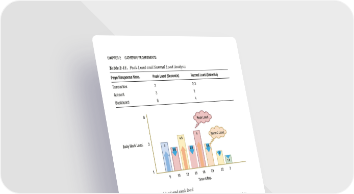 Chapter 2 GatherinG requirements Table 2-11. Peak Load and Normal Load Analysis Page/Response time. Peak Load (Seconds) Normal Load (Seconds) transaction 3 2.3 account 3 2 Dashboard 6 4 6 Peak Load. 4 Normal Load. Work Load. 3 4.5 Daily 3 2.6 2.6 2.6 2 1 1.5 9 10 12 15 18 20 22 3 Time of Day. Figure 2-8. Normal load and peak load When defining the workload for a new application and no existing workload data exists while the system is being developed, the temptation is to specify a high peak workload. Page Hits Analysis You need to consider page response time at normal and peak load for various geographical locations, where you are providing business to your users. This will help you to understand and divide the loads according to the available infrastructure on the basis of workload profile. • Page response time at normal and peak loads for (Hypertext Transfer Protocol) HTTP or (Hypertext Transfer Protocol Secure) HTTPs pages 48