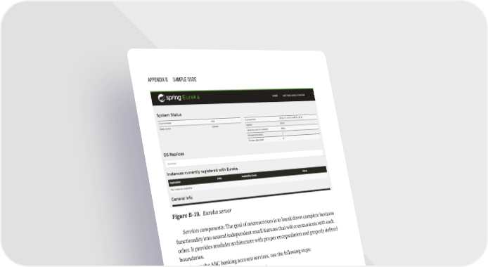 Appendix B SAmple Code Figure B-19. Eureka server Services components: The goal of microservices is to break down complete business functionality into several independent small features that will communicate with each other. It provides modular architecture with proper encapsulation and properly defined boundaries. To run the ABC banking account services, use the following steps: Step 1: Navigate to the source code. D:\DXP\Code\Intergartion_Framework\ABC_Bank_Integration\ Microservices\accountService) Step 2: Execute “mvnspring-boot:run” to start the services. Step 3: Hit the following URL to check the configurations: http://localhost:8083/account/findall The response will be: {"list":[{"accountNumber":10001,"balanceAmount":"200"}, {"accountNumber":10002,"balanceAmount":"200"}, {"accountNumber":10003,"balanceAmount":"200"}]} 360
