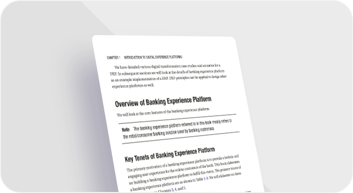 Chapter 1 IntroduCtIon to dIgItal experIenCe platforms We have detailed various digital transformation case studies and scenarios for a DXP. In subsequent sections we will look at the details of banking experience platform as an example implementation of a DXP. DXP principles can be applied to design other experience platforms as well. Overview of Banking Experience Platform We will look at the core features of the banking experience platform. Note the banking experience platform referred to in this book mainly refers to the retail/consumer banking solution used by banking customers. Key Tenets of Banking Experience Platform The primary motivation of a banking experience platform is to provide a holistic and engaging user experience for the online customers of the bank. This book elaborates on building a banking experience platform to fulfill this vision. The primary tenets of a banking experience platform are as shown in Table 1-3. We will elaborate on these platform tenets in Chapters 3, 4, and 5. Table 1-3. Key Tenets of a banking Experience Platform Key Tenets of banking Attributes experience platform Integrated view single-stop-shop experience, aggregation of data from all interfaces personalized experience relevant and contextual information delivery, role-based access Intuitive user experience Interactive and response user interface, omnichannel access self-service enhanced information discovery, smart search, comparison tools, calculators, decision-aiding tools secured transactions easy to use, and simplified and secured transactions 16